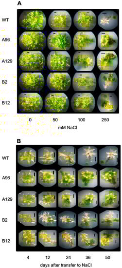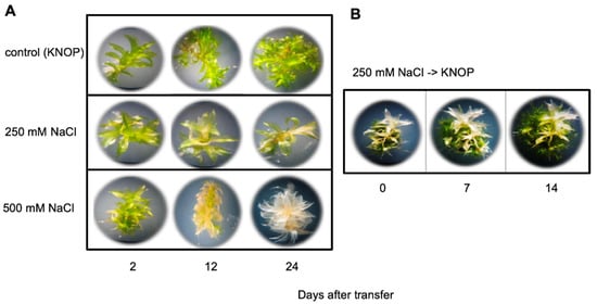 Growth of P. patens gametophores on medium containing high salt concentrations: (A) Individual gametophores are shown that have developed for 2, 12, and 24 days on either control medium without salt or on 250 mM and 500 mM NaCl; (B) Individual gametophores were transferred after 3 weeks from 250 mM NaCl to medium without salt and were photographed 7 and 14 days after transfer. In panel (B), at each time point the same plant was photographed.