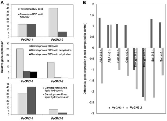 Digital transcription analysis of the two PpGH3 genes under various stress conditions was monitored using available web resources (Phytozome, GeneAtlas, Thermo Fisher Scientific, Dreieich, Germany) [41,42] and GFP browser [43,44]. Since desiccation tolerance can be induced by exogenous ABA [45,46], ABA treatment was also included in this analysis. Upon dehydration, both GH3 genes are strongly downregulated in gametophore tissues, but ABA treatment resulted in the upregulation of PpGH3-2, but not PpGH3-1 in protonema cultures (Figure 3A). This difference could possibly be explained by a promoter element present that would not respond to ABA. Dehydration resulted in a down-regulation of both PpGH3 gene transcripts, whereas salt stress only led to a downregulation of PpGH3-2 in a different web-resource (Figure 3B). In addition, the GH3 genes from P. patens are also developmentally regulated (data not shown; from [43,44]).