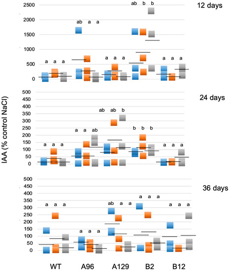 Free IAA levels given as % on control medium (0 mM NaCl). Blue = 50 mM NaCl; orange = 100 mM NaCl; grey = 250 mM NaCl. The IAA was determined at three different time points for three replicates. Different letters indicate significant differences to the control without NaCl at p < 0.05. Each square represents an individual data point and the black dash represents the mean value.