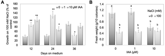 IAA (1 and 10 µM) treatment of WT together with high salt concentration (100 mM). (A) Growth rate as percent of control between 0 and 36 days given as diameter of three time intervals at which the measurements were done and (B) fresh weight after 36 days was recorded. In (A,B), the mean values for 12 plates with 10 colonies on each plate are given. Asterisks in (A) denote statistically significant differences between control and IAA treatments on 100 mM NaCl expressed as percentage of the control, in (B) denote statistically significant differences between control and NaCl treatment (* p < 0.05, ** p < 0.01), and different letters in (B) indicate differences between control and IAA treatments. Calculations for growth rate in (A) were done by measuring the diameter of colonies at 0 days (day of transplanting on fresh medium), diameter of colonies at 12, 24, and 36 days on treatment medium and subtracting the respective later time point from the earlier one. The value for 12 days is thus the difference/growth rate between day 0 and day 12, the value for 24 days growth between 12 and 24 days, and the value for 36 days represents the growth between 24 and 36 days. To show the effect of NaCl compared to control, for each value +/− IAA the percentage of growth on 100 mM NaCl compared to the control was calculated. Values higher than the control value without IAA are an indication that the moss plants are performing better on simultaneous NaCl and IAA treatments.