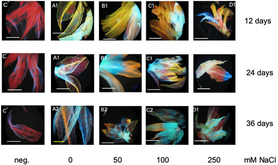 The fluorescence of diphenylboric acid 2-amino-ethyl-ester (DPBA) conjugated to the flavonoid compounds, after excitation with blue light, was used to visualize the locations of the flavonoid compounds in situ according to Buer and Muday [50]. The staining was carried out using individual plants 12, 24, and 36 days after transfer to control and salt-containing plates. A 10% (w/v) stock solution of DPBA in 95% MeOH was prepared, which was diluted to 0.25% DPBA in distilled H2O containing 0.005% (v/v) Triton X-100. All samples were incubated for 15 min and then washed for 5 min in 100 mM sodium phosphate buffer, pH 7 (including 0.005% (v/v) Triton X-100, 0). Negative controls without DPBA reagent were prepared to confirm that the fluorescence colors came from the DPBA conjugates. After staining, the samples were placed on slides using 50% (v/v) glycerol. Fluorescence was visualized by excitation with blue radiation and the following filter (G365/FT395/LP420) on a Zeiss Axioskop 2 (Carl Zeiss, Jena, Germany) fluorescence microscope (at 366 nm the fluorescences of quercetin were yellow, of kaempferol green and of naringenin cyan).