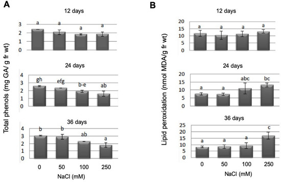 Total phenols determined as gallic acid equivalents (A) and lipid peroxidation as determined as MDA equivalents (B) determined in WT gametophores at different salt concentrations and at three different time points. Bars with different letters are significantly different at p < 0.05. Since the mutant lines did not show any difference in WT in their response to salt stress with these parameters, the complete dataset is displayed in the supplement.