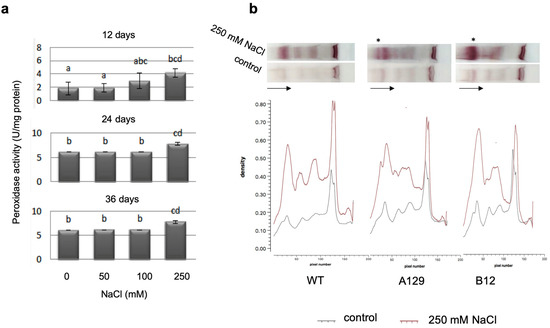 For total peroxidase activity, significant differences after 250 mM NaCl treatment were found, which persisted over all measured time points (Figure 9a). Analysis of specific peroxidase isoforms using a native PAGE method [54] showed some quantitative differences between the treated WT and mutant plants, being the only detectable differences in the whole dataset (Figure 9b). All bands increased in intensity in the salt treated samples of WT and mutants, and an increase in a set of isoenzymes with high molecular mass (marked by asterisks) was found that was higher in the two mutant lines than in the WT. The complete dataset is shown in the Supplementary Materilas (Figure S6).