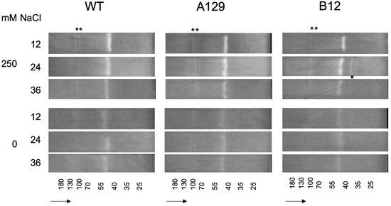 Superoxide dismutate (SOD) isoenzyme separation shown for two selected mutant lines in comparison to WT. Asterisks mark differences between WT and mutant control samples and 250 mM NaCl. For mutant line B12 an additional band is marked. The complete gels including the gel stained with Coomassie blue are shown in the Supplementary Materials (Figure S6). The small numbers at the bottom indicate the approximate molecular masses from marker mixtures. The arrows show the direction of sample flow.