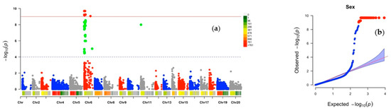 Genome-wide association analysis for plant sex determination in D. alata: (a) Manhattan plot, (b) quantile–quantile (Q–Q) plot. Vertical bars relate to the 20 yam chromosomes, green and red dots indicate chromosomes with influence on the target trait.