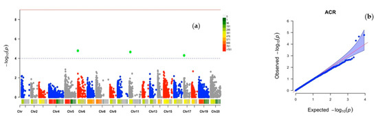 A compressed mixed linear model (CMLM) implemented in the GAPIT R package was used to compute associations using the mixed model [68], where is the vector of the phenotypic observations estimated for the ACR and the PHC, represents the SNP markers (fixed effect), is the random kinship (co-ancestry) matrix, is a vector representing the estimated SNP effects, is a vector representing random additive genetic effects, and is the vector for random residual errors.