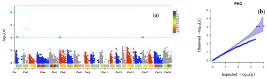 Genome-wide association analysis for percentage high crossability (PHC) in D. alata: (a) Manhattan plot, (b) quantile–quantile (Q–Q) plot. Vertical bars relate to the 20 yam chromosomes, green dots indicate chromosomes with influence on the target trait.