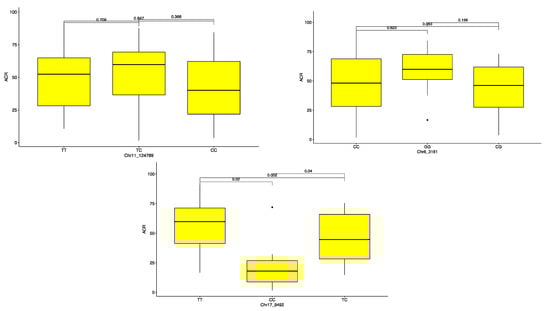 The haplotype segregation showed that among the three markers identified as associated with ACR, Chr17_9492 was the most promising in discriminating genotypes for pollination success (p < 0.05). Of the three variants (TT, CT and CC), the variant CC was associated with low ACR (Figure 6, Table 3). On the other hand, CT and TT were identified as predictors of genotypes with high ACR. The other two SNP markers for ACR showed no significant effects among the different variants. The marker Chr1_215056 allowed discrimination for the PHC: the haplotype AA was associated with high PHC, while the haplotype AG controlled low PHC (Figure 7, Table 3).