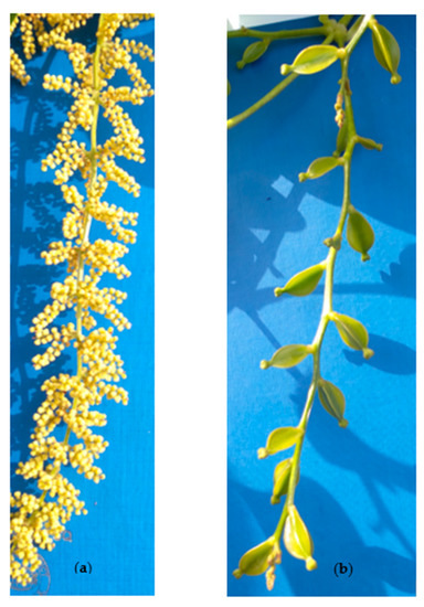 Morphological differences of D. alata flowers based on sex: (a) inflorescence with male flowers, (b) inflorescence with female flowers.