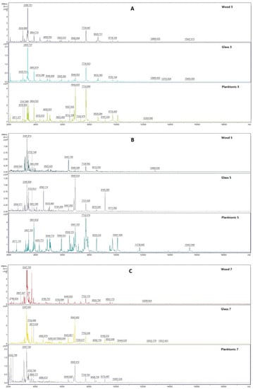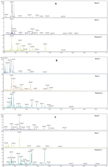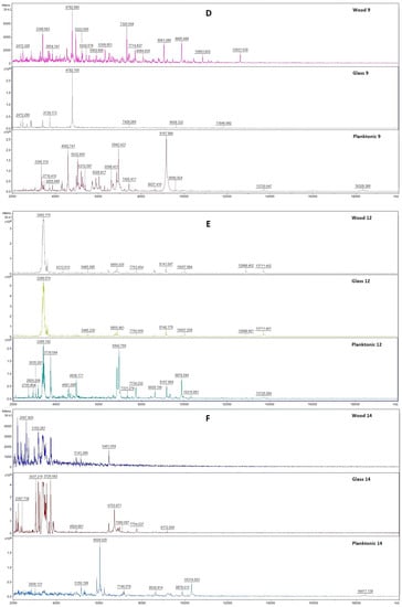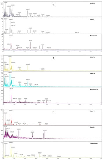 The changes in mass spectra on 5th day were more visible on biofilm formed on wood than on the glass surface (Figure 3B). The changes in the mass spectra, in comparison to control planktonic cells, were observed in biofilm on both surfaces from 7th day (Figure 3C–F).