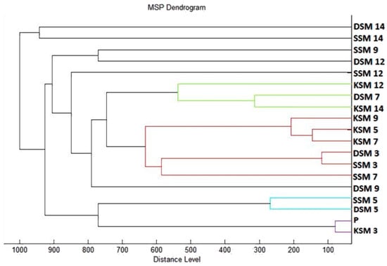 The dendrogram was constructed as a visualization of mass spectra for determination of some similarities of biofilm structure regarding the distance of the MSPs. It can be stated from the constructed dendrogram (Figure 2), that the planktonic stage (P) together with control groups and the young biofilms had the shortest distance from the 3rd day when it grew on the wood and the glass (SSM3 and DSM3, respectively). The similarity in protein profile of the control groups was confirmed by the short distances of the MSPs. The young biofilms and control planktonic cells also had short MSP distances which corresponded with the mass spectra. The distance of MSP experimental groups increased gradually over time. Mass spectra prepared on the 12th and 14th day of the experiment had the longest MSP distances which indicated the changes in the bacterial biofilm protein profile of S. maltophilia.