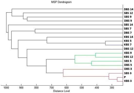 Dendrogram of B. subtilis generated using MSPs for the planktonic cells and the control. BS, B. subtilis; K, control; S, glass; D, wood; P, planktonic cells.
