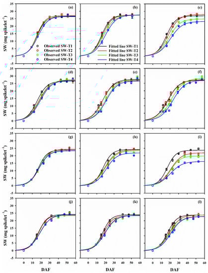The sigmoid relationship of days after flowering (DAF) with spikelet weight (SW) in Huaidao 5 (capital letters panels) and Nanjing 46 (small letters panels) under low-temperature stress (LTS) at the flowering stage (a–c) and (g–i) grain filling stage (d–f) and (i–l) stages. The Tmin/Tmax at T1, T2, T3 and T4 were 21/27, 17/23, 13/19 and 9/15 °C, respectively. Graph (a,d,g,j), (b,e,h,k) and (c,f,i,l) represent LTS durations of 3, 6 and 9 days, respectively. Bars on each symbol show the standard error of means. Observed values of SWm were fitted against DAF using regression analysis.