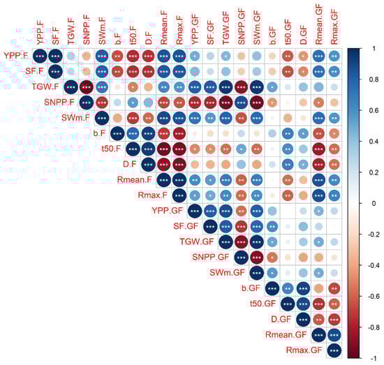 The Pearson correlation matrix between yield as well as yield and grain filling related parameters under low-temperature stress at flowering (F) and grain filling (GF) stages. (YPP) yield per plant; (SF) spikelet fertility; (TGW) thousand grain weight; (SNPP) spikelet number per panicle; (SWm) spikelet weight at maturity; (b) the shape or steepness of the sigmoid curve; (t50) days from flowering to 50% grain filling; (D) days from flowering to 95% (SWm) (Rmean) grain filling rate; (Rmax) maximum grain filling rate. *, ** and *** represent the significant correlation at p < 0.05, p < 0.01 and p < 0.001, respectively.