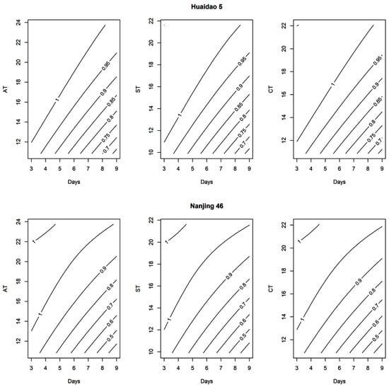 The relative change in YPP with decreasing AT, ST and CT under increasing LTS duration perfectly fitted in the RSM (Table 3). The 10–30% decrease in YPP of Huaidao 5 was observed at 18–12 °C (AT), 16–11 °C (ST) and 17–12 °C (CT) with 9 days duration at flowering, while same decrease in YPP of Nanjing 46 was observed at 20–16 °C (AT), 18–14 °C (ST) and 18–15 °C (CT) with same LTS duration at flowering (Figure 3). Moreover, given that the effect of LTS on yield was most influenced by CT than AT and ST, we quantified the effects of LTS on yield with CT as well as on yield and grain filling related parameters. The coefficient d of RSM was highly significant (p < 0.001) for most of the parameters (YPP, SF, SWm, t50, Rmax, Rmean and D) in both varieties (Table S2), which confirmed the strong interaction of LTS duration with low temperature level. This phenomenon is depicted in contour plots for the effect of post-heading LTS on yield as well as yield and grain filling related parameters in Figures S1–S3.
