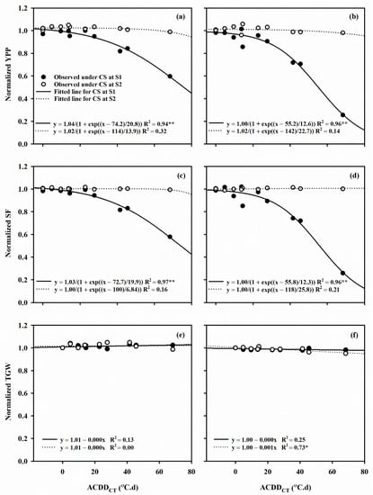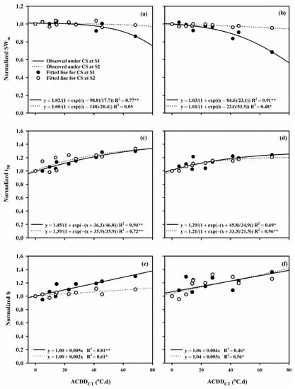 The relationship between the change in canopy temperature based accumulated cold degree days (ACDDCT) and the relative change in (a,b) spikelet weight at maturity (SWm), (c,d) days from flowering to 50% grain filling (t50), (e,f) shape or steepness of curve (b) in Huaidao 5 and Nanjing 46, respectively. (S1) Flowering stage; (S2) grain filling stage. Capital letters represent Huaidao 5 whereas the small letters represent Nanjing 46. ** represents p < 0.01; * represents p < 0.05).
