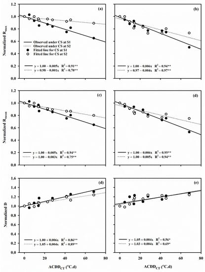 In this study, by integrating the RSM with the canopy temperature based accumulated cold degree days (ACCDCT), we perfectly described (R2 > 0.90) the relative change in YPP, SF, SWm, t50, Rmean and Rmax under varied daily mean CT and LTS duration for both cultivars, which considered the interaction between low temperature and duration. The logistic regression function described the exponential relationship of the relative change in SF, YPP, SWm and t50 to ACDDCT (R2 > 0.90) as previously reported [,]. Even though the ORYZA model for cold-induced sterility during flowering is also empirically derived from ACDDCT, it cannot quantify the cold-induced sterility in environments with large variation in diurnal temperature []. Notably in this study, we observed that even though T4D1 has greater ACCDCT (23 °C.d) than T2D3 (15 °C.d), T2D3 caused greater impact on SF and YPP than T4D1, this observation can be well estimated by integrating the RSM with the ACCD, but still needs to be tested in rice growth models with more independent dataset from wider environments in the near future.