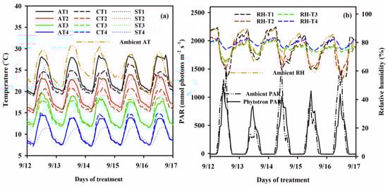 Air temperature (AT) (°C), soil temperature (ST) (°C) and relative humidity (RH) (%) in the phytotrons were monitored at 10 min interval using a VP-4 sensor from METER Group, Inc. (Washington, DC, USA). The canopy surface temperature (CT, °C) and photosynthetically active radiation (PAR, μmol photons m−2 s−1) were also measured at 10 min interval using an SI-111 infrared radiometer, Apogee Instruments Inc (Logan, UT, USA) and QSO-S PAR Photon Flux sensor (Washington, DC, USA), respectively. The sensors were installed as previously described [,]. Diurnal AT, ST, CT, RH and PAR changes under the four temperature levels are shown in Figure 1. The CT and ST were lower than ATs. However, in T3 and T4 chambers with 6 and 9 days durations, the CT was slightly higher than AT. At T1, T2, T3 and T4, the daily average ATs were 23.8, 19.2, 14.8 and 11.2 °C, respectively. The STs were 21.6, 17.4, 14.1 and 9.9 °C, respectively, whereas the CTs were 22.2, 17.5, 14.1 and 11.1 °C, respectively (Figure 8a). The daily average PAR in chambers were about 700 μmol photons m−2 s−1 and 400 μmol photons m−2 s−1 on sunny and cloudy days, respectively. The daytime RH was about 75% and 65% at T3/T4 and T1/T2, respectively (Figure 8b).