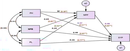 The path analysis approach was used to assess the relationships between seed yield per plant (SYP) as the dependent variable and plant height (PH), number of primary branches per plant (NPB), average pod length (PL), and number of pods per plant (NPP) as independent variables. Relationships between the dependent and independent variables are shown in Figure 1.