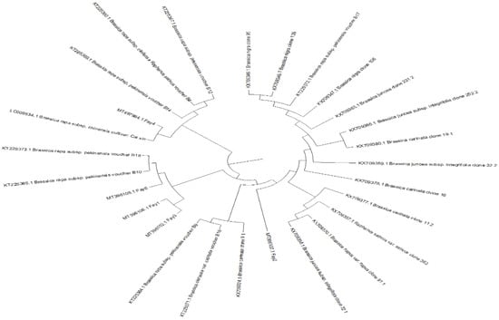 The ITS region of the nuclear rDNA was amplified by PCR using the primers of ITS1 and ITS4 []. Clear and sharp amplification bands were purified and sequenced for phylogenetic studies. The amplified fragment sequence 750 bp was identified and analyzed using a 3130 genetic analyzer. Phylogenetic tools have allowed many genera and species to be grouped using traditional taxonomic methods. The sequence was sent to the BLAST database to look for homologies with other ITS sequences. After comparing the sequence of the studied strain with the sequences sent to GeneBank, the percentages of similarity and accession numbers were obtained. Nucleotide variation of the nuclear ITS regions was used to study phylogenetic relationships among the examined genotypes. The fraction of nitrogenous bases in a DNA or RNA molecule that are either guanine (G) or cytosine (C) is known as GC-content (or guanine–cytosine content) (C). This metric represents the percentage of G and C bases in a total of four bases, which includes adenine and thymine in DNA and adenine and uracil in RNA. The Mol (%) of nucleotide A, C, G, and T were calculated using BioEdit 7.2 program to differentiate between nucleotides through selected landraces. Analyses of the ITS gene using different restriction enzymes (Eco RI, Nco I, Bam HI, Tfi I, AgsI, Eco 571, and Cfr10I) were fulfilled. PCR-Restriction Fragment Length Polymorphism (PCR-RFLP): the ITS PCR products of the five samples were digested using different restriction enzymes. The digested products were fractionated and the Brassiceae isolates were characterized.