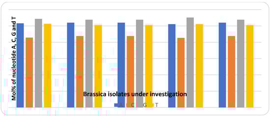 Multiple sequence alignments of the ITS regions were conducted to identify individual ITS types, with the others presented in NCBI (Figure 3). The accession numbers in GeneBank for the selected plant accessions were MT396106.1 for Fay1, MT396107.1 for Fay2, MT396102.1 for Fay3, MT497984.1 for Fay4, and MT396105.1 for Fay6. Mega X software was used to construct a phylogenetic tree (Figure 3), which revealed that Fay1, Fay2, Fay3, and Fay4 were more closely related to B. rapa, while Fay6 had individual branches in the tree that were more closely related to B. carinata. These observations indicated a variety of origins. Guanine–Cytosine (GC) material was found to be very similar in ITS sequences. The GC-content of a DNA or RNA fragment or a whole genome may be determined. It can refer to the GC content of a specific gene or segment of a gene (domain), a collection of genes or gene clusters, a non-coding area, or a synthetic oligonucleotide, such as a primer, when referring to a fragment. The GC content in all accessions was found to be around 49% using the ITS sequence in the current study. The G + C contents (%) of the five Brassica isolates were as follows: Fay3 (48.78), Fay6 (48.78), Fay1 (48.56), Fay2 (48.78), and Fay 4 (48.91). The Mol (%) of nucleotides A, C, G, and T, and the differentiation between nucleotides through selected isolates and data, are presented in Figure 4.