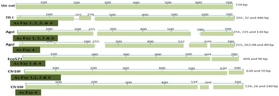 All Brassica isolates under investigation contain a single restriction site for Eco RI, Nco I, and Bam HI, as presented in Figure 5; these enzymes have the same restriction site in the five Brassica isolates. On the other hand, Tfi I, AgsI, Eco 571, and Cfr10I have a different restriction site, as displayed in the restriction map (Figure 6).