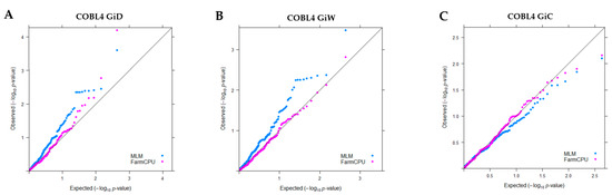 When pairs of adjacent loci were found to demonstrate LD, only one of the two SNPs from each pair was used in marker–trait association analysis, leaving 55 SNPs and 162 Indels in the candidate gene. Of these, 63, 55 and 99 polymorphic sites were located in exons, introns, and the 3’ UTR, respectively, of this gene. The FarmCPU model showed a straight line close to 1:1 with a slightly deviated tail in the Q-Q plots, suggesting that this model controlled both false positives and false negatives (Figure 2). FarmCPU showed a trend of association with GID and GIW toward 3’ UTR of the COBL gene. The most associated position with GID (Table 3 and Figure 3) was the SNP at 5589 bp (p = 6.50 × 10−5; q = 0.014) explaining 11.1% of the phenotypic variance. The suggestive association (p < 0.01) with GID and GIW was the SNP at 3221 in intron5.