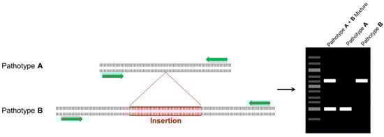 Amplicon length distinction can be used to differentiate pathotypes in PCR-based assays. In this methodology, the insertion/deletion (indel) polymorphism is positioned within the amplicon, and the assay relies on electrophoretic separation of amplified DNA fragments. Pathotype clustering may be performed based on the molecular weight of the band in the gel (Figure 2). This technique was used to distinguish defoliating from non-defoliating pathotypes of Verticillium dahliae Kleb., the pathogen responsible for the Verticillium wilt disease of cotton (Gossypium hirsutum L.) [58]. The assay was found to be effective in identifying genetic relationships among pathotypes. This rapid technique is advantageous in its use of a single primer pair that is conserved among the tested races/pathotypes, and it is a simple conventional PCR method that can be easily adopted by diagnostic laboratories at minimal cost. However, this technique is dependent on the existence of a discriminatory insertion or deletion and an appropriate conserved region for primer design around the amplicon, and these may not be as abundant as necessary to provide sufficient resolution.