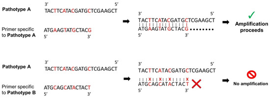This figure summarizes the SNP-based distinction method. Primers are designed to target a distinctive polymorphic sequence specific to a pathotype or pathotype cluster. When a primer specific to the hypothetical pathotype A is used against hypothetical pathotype A, amplification occurs because of the perfect match of primer and DNA template. However, when a primer specific to hypothetical pathotype B is used against hypothetical pathotype A, mismatches prevent amplification.