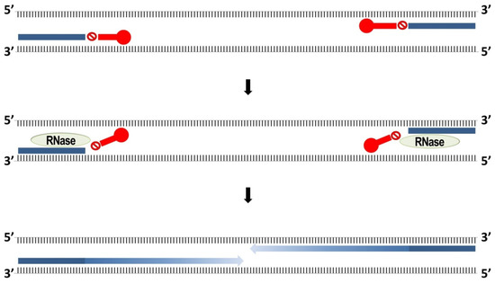 This figure summarizes RNase-H dependent (rhPCR). The rhPCR primers are blocked by a ribonucleotide residue as represented by the stop symbol, followed downstream by 4 DNA bases complementary to the template as shown in red. The red circle at the 5′ end of the blocked primer is a propanediol C3 spacer. Once the RNase H2 enzyme comes in and cleaves off the ribonucleotide residue, the primers are activated and extension by DNA polymerase continues.