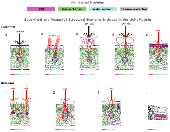 Conceptual representation of the optical properties of the nine (a–i) structural elements of leaves (typical bifacial leaves with various structural idiosyncrasies (a–h) and representative bamboo leaf (i)) included in the light module: (a) cuticle light reflectance, (b) epidermal cell light focusing, (c) non-glandular hair light reflectance and scattering, (d) gland light reflectance and scattering, (e) multiseriate sclerified hypodermis light scattering, (f) crystal or cystolith light scattering, (g) bundle sheath extension light scattering and path lengthening, (h) sclereid light transfer, and (i) bamboo’s fusoid cell. Five elements are superficial (a–e) and four elements are located in the mesophyll (f–i). The structural elements presented are highlighted in magenta in each drawing. In each structural element, arrows (red for photosynthetically active radiation (PAR) and black for ultraviolet radiation (UV)) show surface light reflectance, surface and mesophyll light scattering, and hypothesized light path lengthening. Light absorption phenomena (e.g., UV radiation absorption from epidermal cells in (a)) are omitted for clarity. The optical properties for bamboo fusoid cells (i) were not conceptualized due to the unavailability of data from the literature. Colour coding represents the four functional modules of leaves (light, gas exchange, water–nutrient, and defense–protection modules) and coloured rectangles under each drawing show all the functional modules in which each element participates.