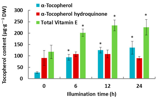 Tocopherol composition and content in the etiolated leaves of 14-day-old rice plants during de-etiolation. Values represent the mean of five biological replicates and bars represent standard deviations. Asterisks indicate statistically significant differences compared with the control (0 h illumination) according to the Student’s t-test: * p < 0.05.