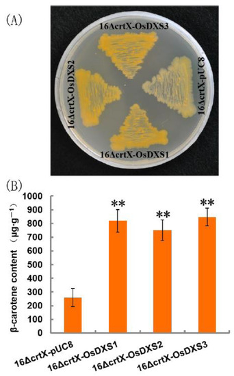 Functional analysis of the OsDXS gene family. (A) Color complementation and enhanced β-carotene accumulation due to the expression of OsDXS1, OsDXS2, and OsDXS3, respectively, in E. coli engineered for β-carotene biosynthesis. The plate was divided into four sections, which were inoculated separately with bacteria carrying pACCAR16∆crtX and pUC8-OsDXS1 (16∆crtX-OsDXS1), pACCAR16∆crtX and pUC8-OsDXS2 (16∆crtX-OsDXS2), pACCAR16∆crtX and pUC8-OsDXS3 (16∆crtX-OsDXS3), or pACCAR16∆crtX and pUC8 (empty vector as a control) (16∆crtX-pUC8). (B) Production of β-carotene production by E. coli strains expressing OsDXS1/2/3. Lane 16∆crtX-pUC8, E. coli strain expressing pACCAR16ΔcrtX and pUC8; Lane 16∆crtX-OsDXS1, E. coli strain expressing pACCAR16ΔcrtX and pUC8-OsDXS1; Lane 16∆crtX-OsDXS2, E. coli strain expressing pACCAR16ΔcrtX and pUC8-OsDXS2; Lane 16∆crtX-OsDXS3, E. coli strain expressing pACCAR16ΔcrtX and pUC8-OsDXS3. Values represent the mean of five biological replicates and error bars represent standard deviations. Double asterisks indicate highly significant differences compared with the control (p < 0.01, Student’s t-test).
