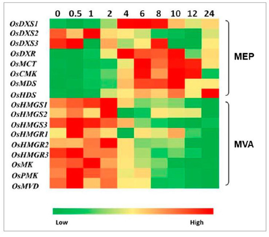 The analysis of Arabidopsis revealed that the genes involved in the MVA and MEP pathways behaved differently in response to light stimulation. The expression levels of MVA pathway genes were inhibited by light, whereas those of MEP pathway genes were upregulated [8]. In rice, Kim et al. (2005) [11] reported that, in the case of light illumination, only the relative expression of OsDXS1 increased relative to the unilluminated control. OsDXS3 has been proposed to be specifically involved in the synthesis of diterpenoid phytoalexins (such as momilactones and phytocassanes) in suspension-cultured rice cells after treatment with a chitin elicitor [12,22].