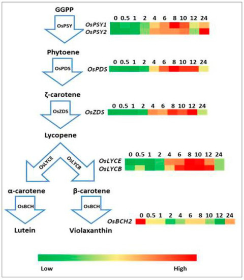 - Chaudhary, N.; Nijhawan, A.; Khurana, J.P.; Khurana, P. Carotenoid biosynthesis genes in rice: Structural analysis, genome-wide expression profiling and phylogenetic analysis. Mol. Genet. Genom. 2010, 283, 13–33. [Google Scholar] [CrossRef] [PubMed]