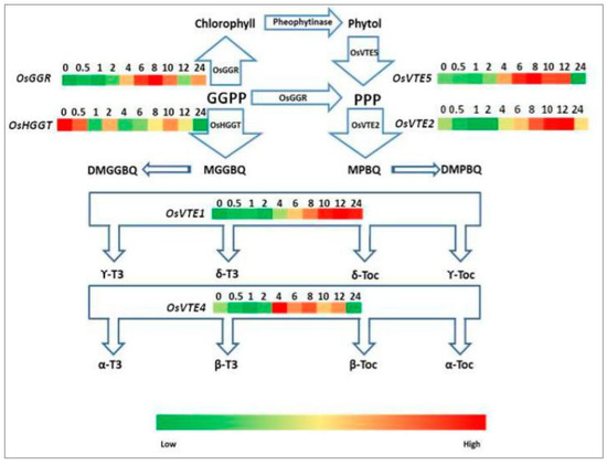 - Chaudhary, N.; Khurana, P. Vitamin E biosynthesis genes in rice: Molecular characterization, expression profiling and comparative phylogenetic analysis. Plant Sci. 2009, 177, 479–491. [Google Scholar] [CrossRef]