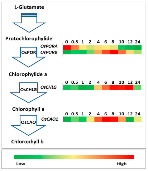 So far, the function of a few chlorophyll biosynthesis genes (rice chlorophyll synthase gene (OsCHLG) and rice chlorophyll a oxygenase 1 gene (OsCAO1)) has been demonstrated [4,18,19]. Changes in the expression levels of the selected chlorophyll biosynthetic pathway genes during rice de-etiolation are shown in Figure 6. The expression levels of OsPORA (protochlorophyllide oxidoreductase A gene) and OsPORB reacted differently to WL illumination. The OsPORB mRNA level increased significantly in the first 8 h (15-fold higher than that in dark control) and decreased rapidly after 24 h of illumination. The expression level at 24 h was approximately three-fold greater than in the dark control. However, the expression of OsPORA started to decline after exposure to WL, indicating that OsPORA was downregulated by light. The expression of OsCHLG increased in the first 0.5 h of illumination, decreased slightly after 2 h of illumination, increased again after 4 h of irradiation, and remained stable from 8 to 12 h. The maximum expression level was 4.5-fold higher than that in the dark control, which was detected after 12 h irradiation. After that, OsCHLG expression decreased immediately to the same level as that in the dark control. The expression level of OsCAO1 reached a peak after 6 h of illumination (8.4-fold), decreased until 12 h, and slightly increased again from 12 to 24 h.