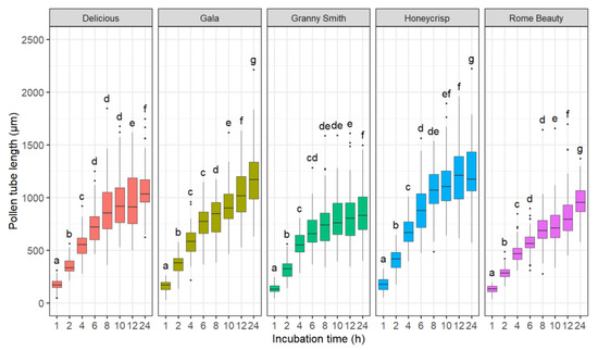Effect of incubation time on in vitro pollen tube length of ‘Delicious’, ‘Gala’, ‘Granny Smith’, ‘Honeycrisp’, and ‘Rome Beauty’. Different letters indicate significant differences among incubation times within cultivars based on Games-Howell test (p < 0.05).