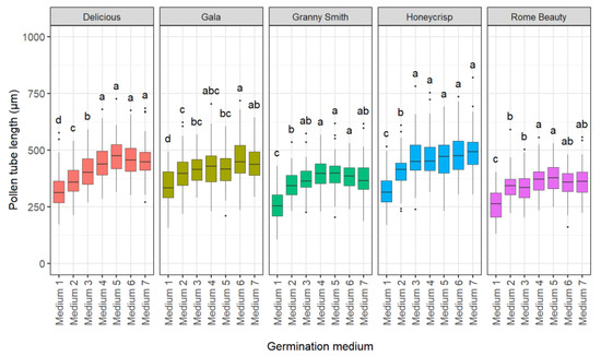 Effect of germination media on in vitro pollen tube length of ‘Delicious’, ‘Gala’, ‘Granny Smith’, ‘Honeycrisp’, and ‘Rome Beauty’. Different letters indicate significant differences among germination media within cultivars based on Fischer’s LSD test (p < 0.05).