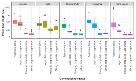 Effect of germination technique on in vitro pollen tube length of ‘Delicious’, ‘Gala’, ‘Granny Smith’, ‘Honeycrisp’, and ‘Rome Beauty’. Different letters indicate significant differences among germination techniques within cultivars based on Fischer’s LSD test (p < 0.05).