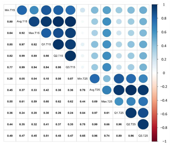 Spearman correlation coefficients between variables. Variables include the minimum (Min.), average (Avg.), maximum (Max.), first (Q1), second (Q2) and third quantile (Q3) of the pollen tube length measured at 15 °C (T15) and 25 °C (T25). Data were combined from 41 individuals. Color bar on the right represents the range of the correlation coefficient, ranging from −1 (dark red, strong negative correlation) to 1 (dark blue, strong positive correlation).