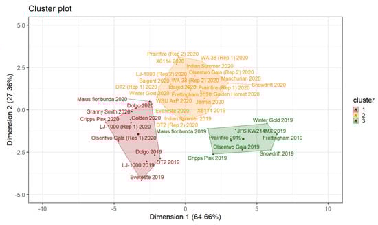Thirteen individuals were evaluated in 2019 and 2020 to determine the between-year variability. Only three individuals (‘Dolgo’, ‘Indian Summer’, and ‘X6114’) were in the same cluster during those two consecutive years. Seven individuals, including ‘DT2’, ‘Everest, ‘Frettingham’, ‘LJ-1000’, ‘Prairifire’, ‘Snowdrift’, and ‘Winter Gold’, showed a variable performance. ‘Cripps Pink’, Malus floribunda, and ‘Olsentwo Gala’ showed high between-year variability. All three cultivars showed good performance in 2019 (cluster 3) and low performance in 2020 (cluster 1). Interestingly, the only cultivars that were closest to the third cluster center were ‘Cripps Pink’, ‘Frettingham’, ‘JFS KW214MX’, Malus floribunda, ‘Olsentwo Gala’, ‘Prairifire’, ‘Snowdrift,’ and ‘Winter Gold’ in 2019 (Figure 5). These six cultivars were located closest to the second cluster’s centroid in 2020, indicating a lower overall performance at 15 °C in 2020. The average coordinates of the 13 individuals in 2019 were 1.73 and −1.81 on the first and second dimensions, respectively. In 2020, the average coordinates of these cultivars were −0.82 on the first and 1.18 on the second dimension.