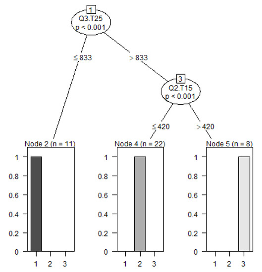 A decision tree model was used to predict class membership based on 12 variables (Figure 6). Individuals can be grouped based on two variables: the third quantile at 25 °C (Q3.T25) and the second quantile at 15 °C (Q2.T15). If Q3.T15 is equal to or smaller than 833 µm, the individual belongs to the first cluster. The Q2.T15 value separates the second cluster from the third cluster. If the Q2.T15 value is smaller or equal to 420 µm, then the individual belongs to the second cluster.