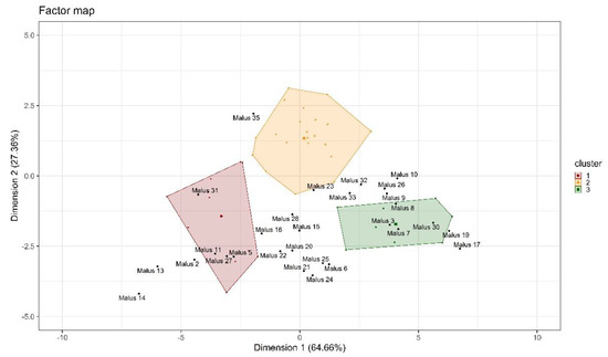 The coordinates on the factor map of 29 apple accessions were predicted using the results of the subgroups previously identified. The accessions were relatively evenly distributed around the first dimension, with a tendency to lower the second dimension’s coordinates (Figure 7). The accessions were evaluated based on their position on the first and second components, alongside the distance to the nearest cluster center. Twelve accessions (41.4%) were closest to the centroid of the first cluster (Dim 1: −2.86, Dim 2: −1.14), 3 accessions (10.3%) were closest to the second (Dim 1: 0.45, Dim 2: 1.39), and 14 accessions (48.3) were closest to the third cluster (Dim 1: 4.43, Dim 3: −1.69). Several accessions were located outside the initial bounding box of three of their clusters (Figure 7). Accessions closest to the center of the first cluster included Malus 2, Malus 5, Malus 11, Malus 13, Malus 14, Malus 15, Malus 16, Malus 20, Malus 21, Malus 22, Malus 27, and Malus 31, while Malus 23, Malus 28 and Malus 35 were closest to the second cluster center. Accessions closest to the third cluster included Malus 3, Malus 6, Malus 7, Malus 8, Malus 9, Malus 10, Malus 17, Malus 19, Malus 24, Malus 25, Malus 26, Malus 30, Malus 32, and Malus 33. The cluster memberships of the 29 Malus accessions were also determined using thresholds from the decision tree approach. The predicted cluster membership of all accession, except for Malus 15, which was assigned to the first cluster using the PCA approach and to the second cluster using the decision tree approach, was like the PCA approach (Table S2).