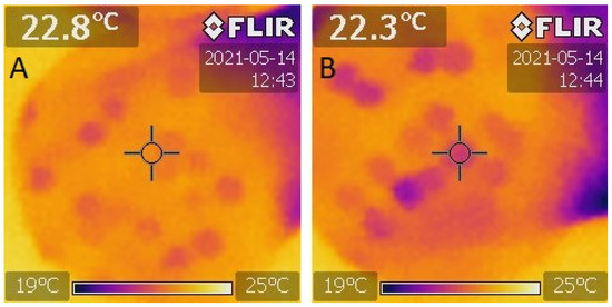 IR thermal imaging of healthy and damaged pea seeds caused by B. pisorum 24 h after the artificial germination. (A): healthy; (B): damaged seeds.