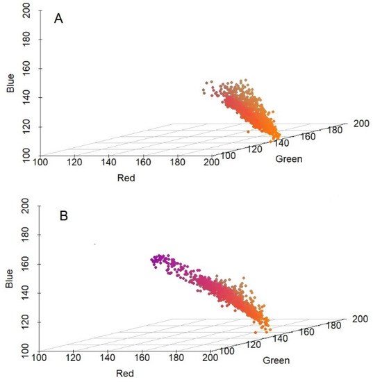 The result of the red, green, blue (RGB) colour analysis revealed that there was no significant difference in IR images (i.e., in the heat radiation) of healthy and damaged pea seeds. Figure 2 shows the 3D scatterplot of RGB codes (Red, Green, Blue codes ranging from 0 to 255) of healthy (a) and damaged (b) pea seeds. The one-way ANOVA showed that the p-values of Red, Green, Blue codes between healthy and damaged seeds were p < 0.001, 0.186, and p < 0.001, respectively. The calculated F-value in the cases of red and blue codes were 42.73 and 173.63, respectively, while the critical F-value with n-2 freedom of degree and on 0.05 significance level was 3.84 in both cases. The calculated value exceeds the critical value. The F-value of green codes was 1.75 with the same critical F-value. Therefore, it can be stated, that there was no significant difference between the red and blue codes, while there was a significant difference between the green codes of healthy and damaged pea weeds.