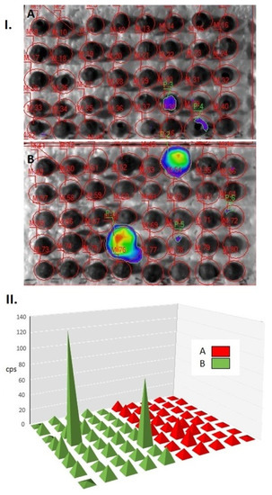 Data of biophoton emission (average counts per second) recorded from pea seeds (I). 2 D images of pseudo colour-coded pixel intensity values; (II). CPS values illustrated in coordinate system; A: healthy; B: damaged seeds.