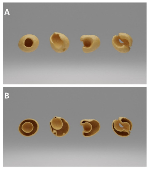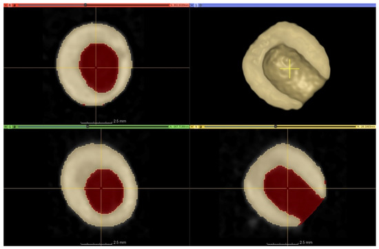 The stored images in DICOM (Digital Imaging and Communications in Medicine) format were converted to NifTI (Neuroimaging Informatics Technology Initiative) format; then, every image processing step was performed in Python with open-source or custom-made software library and code. Otsu’s thresholding method was used in combination with morphological operators for producing initial binary masks (M1), which represents the actual state of the peas. Masks describing the approximated intact condition of the peas (M2) were created from M1 with additional “growing” morphological operators—thus, the voxels of M1 were a subset of M2’s voxels (Figure 5).
