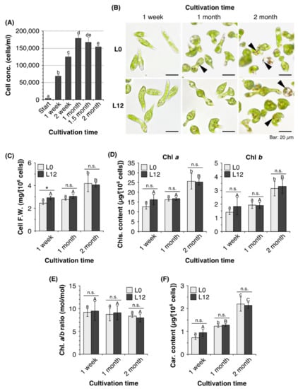 Characterization of Euglena gracilis cells in cultures of different ages. (A) Time course of cell concentrations of E. gracilis cells grown under 12 h/12 h light/dark cycles for 2 months. Data are means ± SD (n = 5). (B) Appearance of E. gracilis cells grown under 12 h/12 h light/dark cycles for 2 months. Algal cells were observed under a bright-field microscope at the beginning (L0) and the end (L12) of the light period after 1 week, 1 month, and 2 months in culture. Arrowheads indicate pigmented brown globules within cells. (C–F): (C) Cell fresh weight; (D) chlorophyll a and b content; (E) chlorophyll a:b ratio; and (F) total carotenoid content of cells from 1-week-old and 1- or 2-month-old cultures. Data are means ± SD (n = 3). Bars labeled with the same letter do not differ significantly from one another (Tukey’s multiple range test, p < 0.05). n.s.: not significant; *: p < 0.05 (t-test).