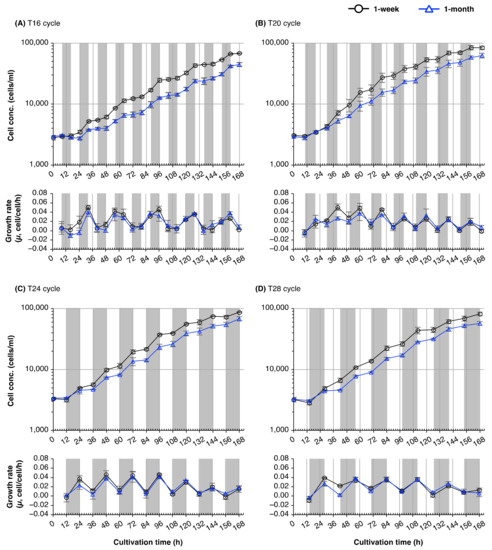 Synchronizing the external light/dark cycle with the internal rhythm enhances fitness in cyanobacteria and land plants [18,19]. To determine whether the circadian period of E. gracilis changed with culture age, we examined circadian resonance by measuring cell numbers in cultures of different ages under non-24-h light/dark cycles (T-cycles). When E. gracilis was grown under 8 h/8 h light/dark cycles (T16), the number of cells increased rhythmically, but the time of peak growth rate was independent of the external light/dark cycle (Figure 2A). Cultivation of cells from 1-week-old and 1-month-old cultures in T16 cycles for 7 days produced concentrations that were 17–22% and 21–29% lower, respectively, than those produced by growth for the same time in other light/dark regimes (Supplementary Figure S1). On the other hand, when cells from 1-week-old and 1-month-old cultures were grown under 10 h/10 h, 12 h/12 h, or 14 h/14 h light/dark cycles (T20, T24, and T28 cycles, respectively), the cell counts increased during the dark period, and the peak growth rate was synchronized to the external light/dark cycle (Figure 2B–D).